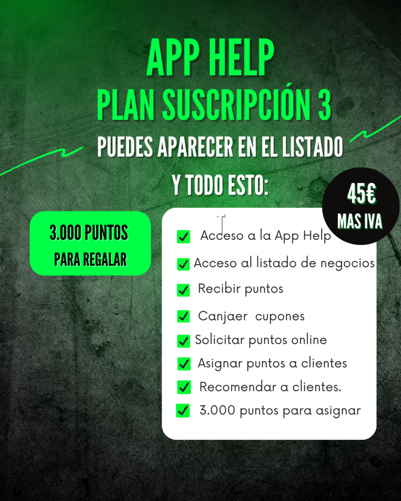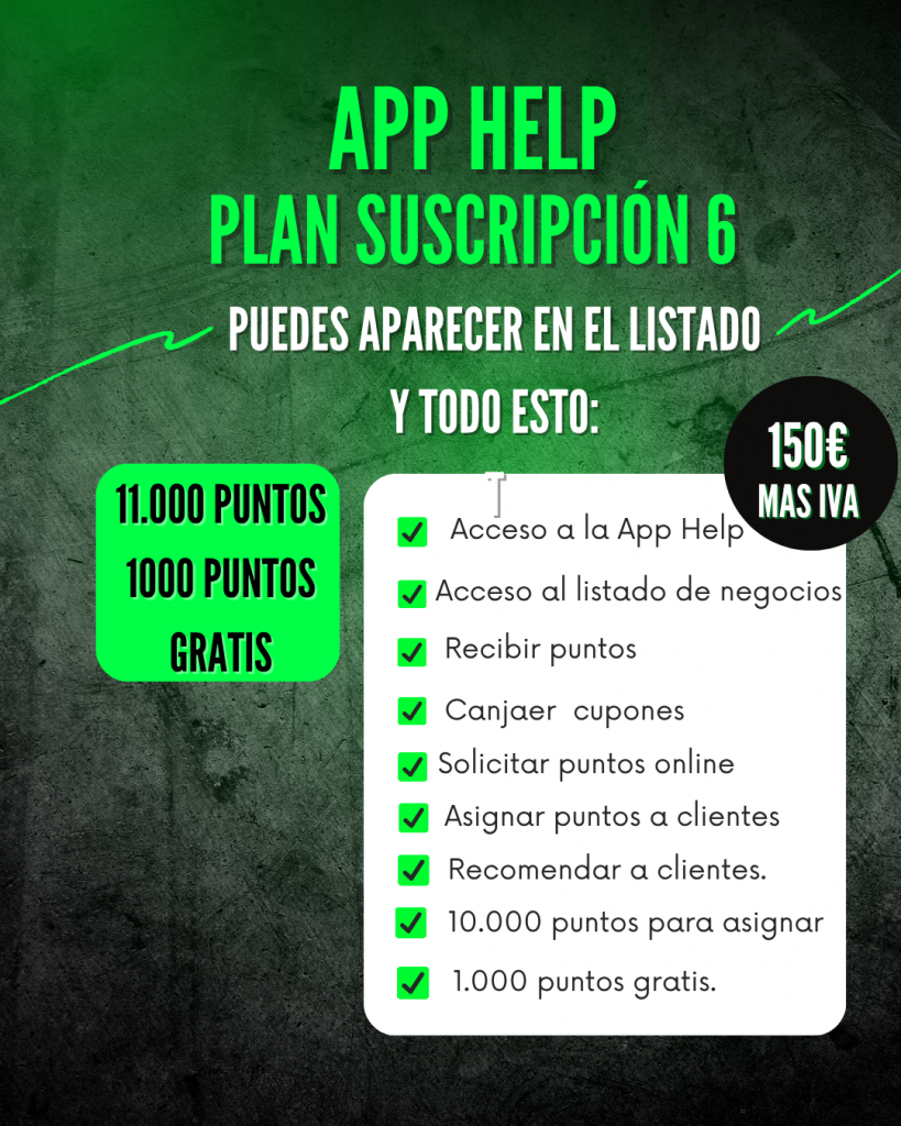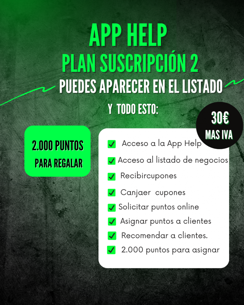 Suscribiéndote a un plan puedes aparecer en el listado de negocios gratis y regalar puntos a los clientes que lo soliciten. Elige un plan de 1000 puntos desde 15€ al mes.